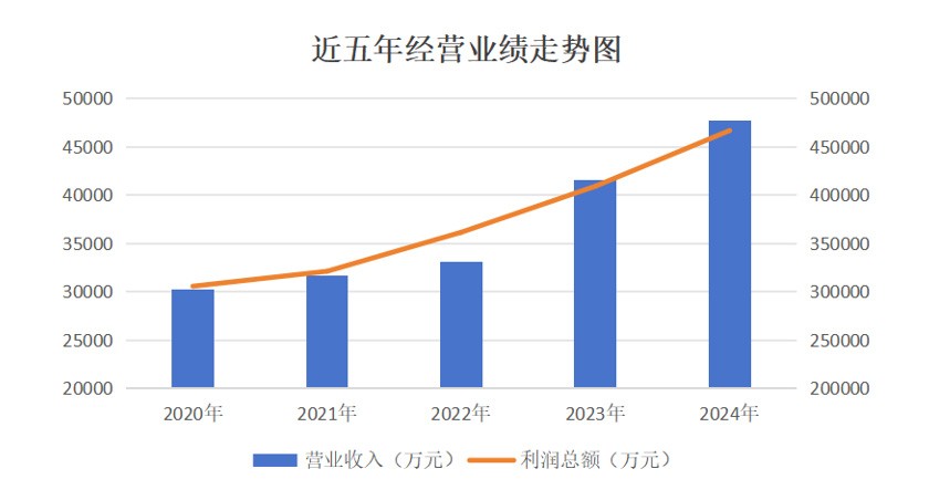 近年来,公司经营业绩实现稳中快进。2020年-2024年,营业总收入分别为人民币 30.25亿元 、31.72亿元、33.13亿元、41.60亿元、47.76亿元;利润总额分别为人民币3.06亿元、3.21亿元、3.62亿元、4.09亿元、4.67亿元。